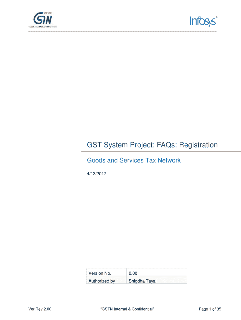 GST System Project: FAQs: Registration Goods and Services Tax Network 4/13/2017Ver. Rev.2.00Version No.2.00Authorized bySnigdha TayalGSTN Internal & Confidential Page 1 of 35ConfidentialityAgreement