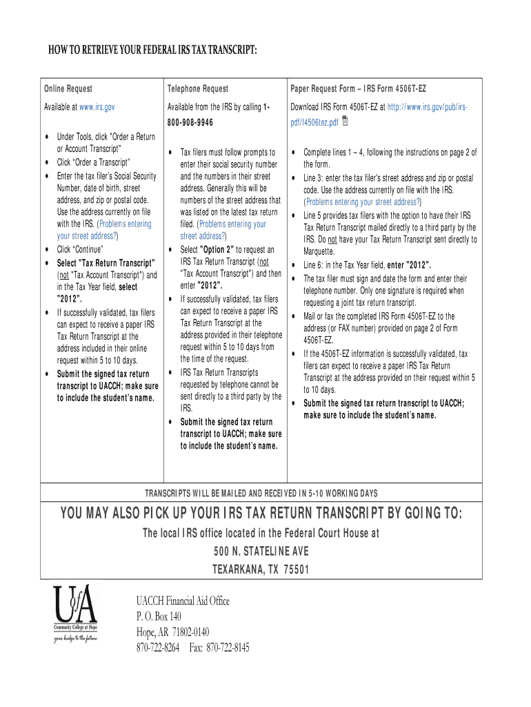 Get the free You may also pick up your irs tax return transcript by going to - uacch