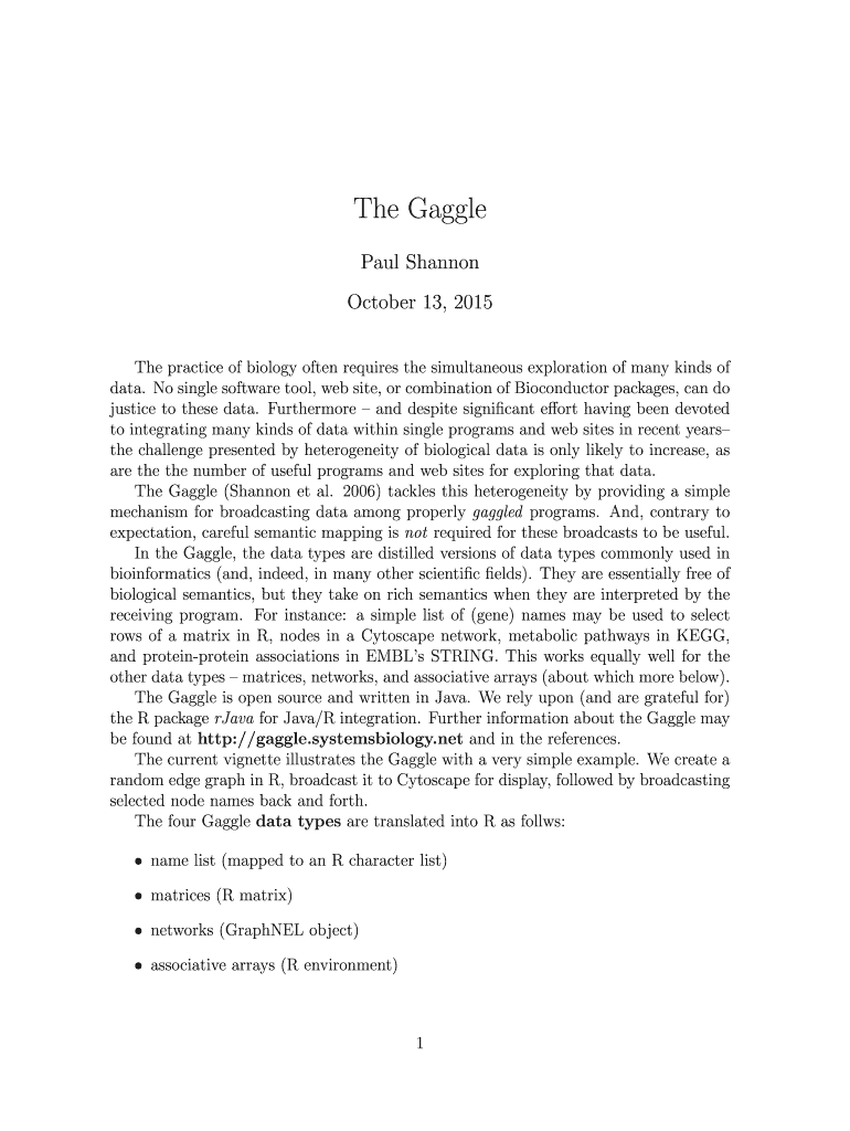 The Gaggle Paul Shannon October 13, 2015, The practice of biology often requires the simultaneous exploration of many kinds of data. No single software tool, website, or combination of Bioconductor
