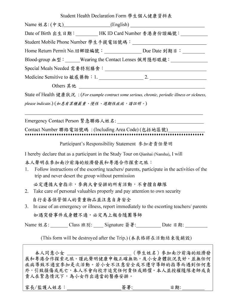 Student Health Declaration Form Name : ()(English) Date of Birth HK ID Card Number Student Mobile Phone Number Home Return Permit No. Due Date Blood group Wearing the Contact Lenses Special Meals