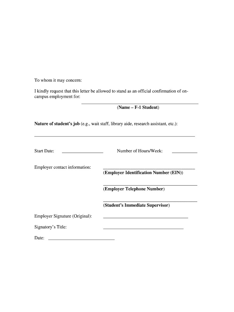 To whom it may concern: I kindly request that this letter be allowed to stand as an official confirmation of on campus employment for: (Name F1 Student)Nature of students job (e.g., wait staff, library