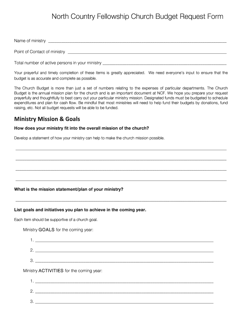 North Country Fellowship Church Budget Request Form Name of ministry Point of Contact of ministry Total number of active persons in your ministry Your prayerful and timely completion of these items