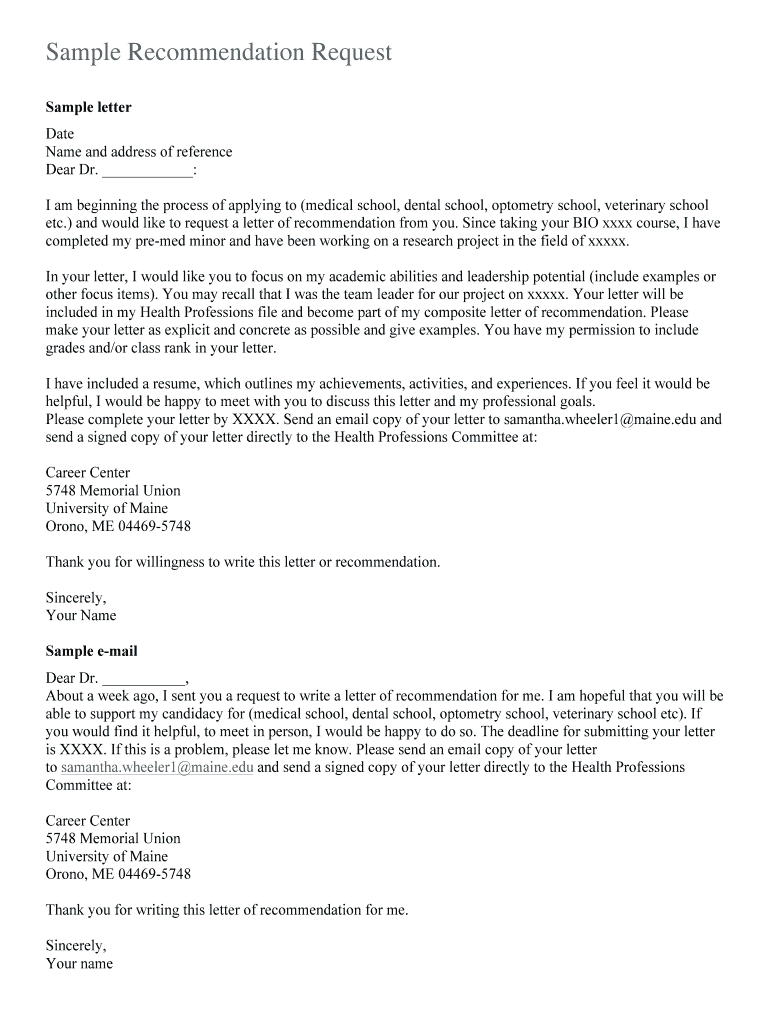 Sample Recommendation Request Sample letter Date Name and address of reference Dear Dr. : I am beginning the process of applying to (medical school, dental school, optometry school, veterinary school