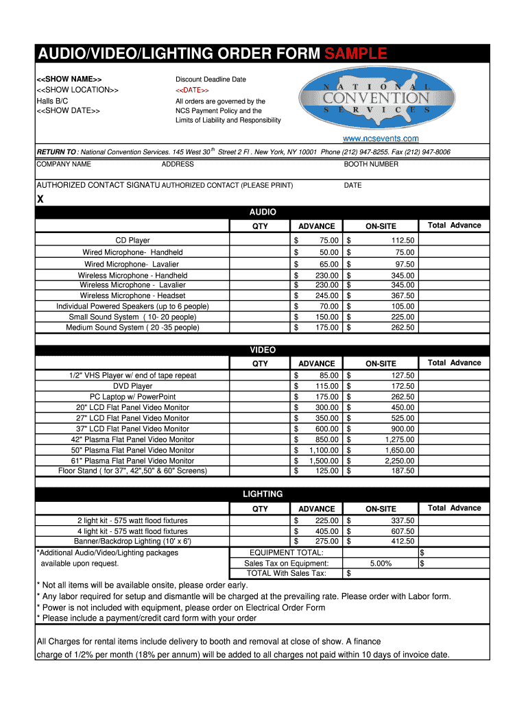 AUDIO/VIDEO/LIGHTING ORDER FORM SAMPLE