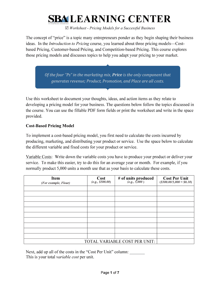 CLEAR FORM Worksheet Pricing Models for a Successful Business concept of price is a topic many entrepreneurs ponder as they begin shaping their business ideas. In the Introduction to Pricing course,