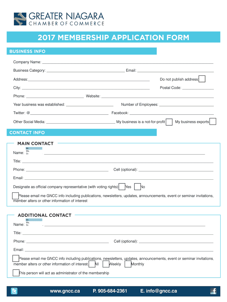 2017 MEMBERSHIP APPLICATION FORM BUSINESS INFO Company Name: Business Category: Email: Address: Do not publish address: city: Postal Code: Phone: Website: Year business was established: Number of