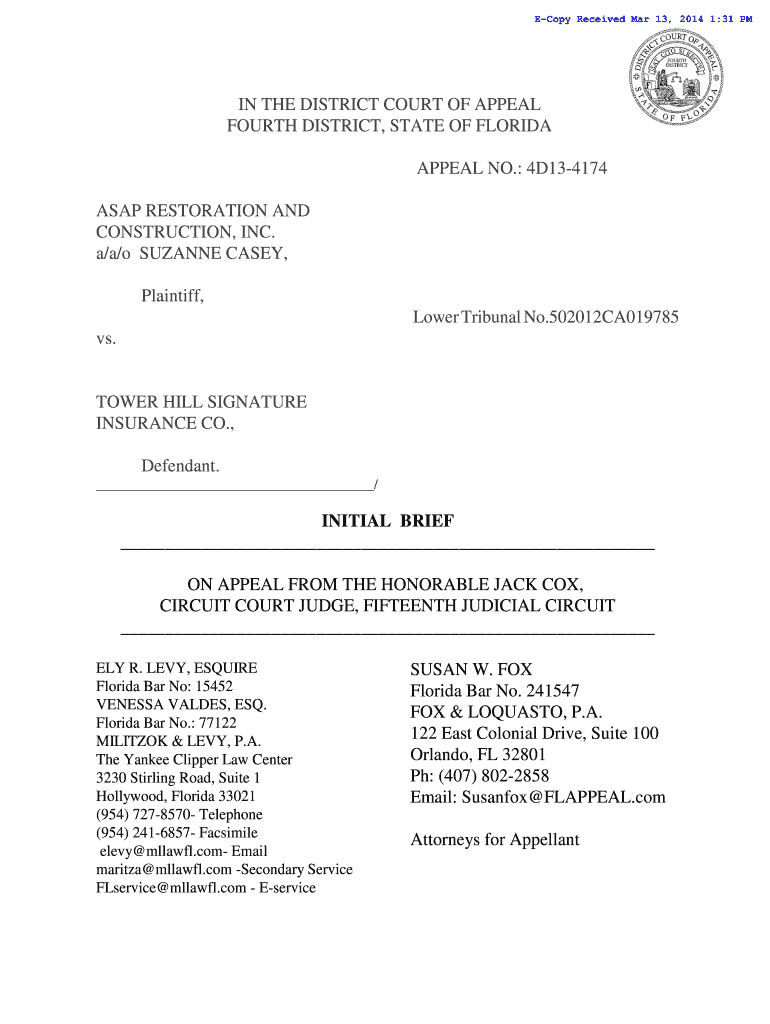 Copy Received Mar 13, 2014 1:31 PAIN THE DISTRICT COURT OF APPEAL FOURTH DISTRICT, STATE OF FLORIDA APPEAL NO.: 4D134174 ASAP RESTORATION AND CONSTRUCTION, INC. a/a/o SUZANNE CASEY, Plaintiff, Lower