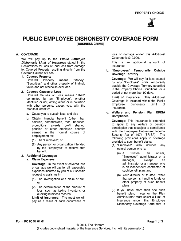 PROPERTY CHOICEPUBLIC EMPLOYEE DISHONESTY COVERAGE FORM (BUSINESS CRIME)A. COVERAGE We will pay up to the Public Employee Dishonesty Limit of Insurance stated in the Declarations for loss of, and