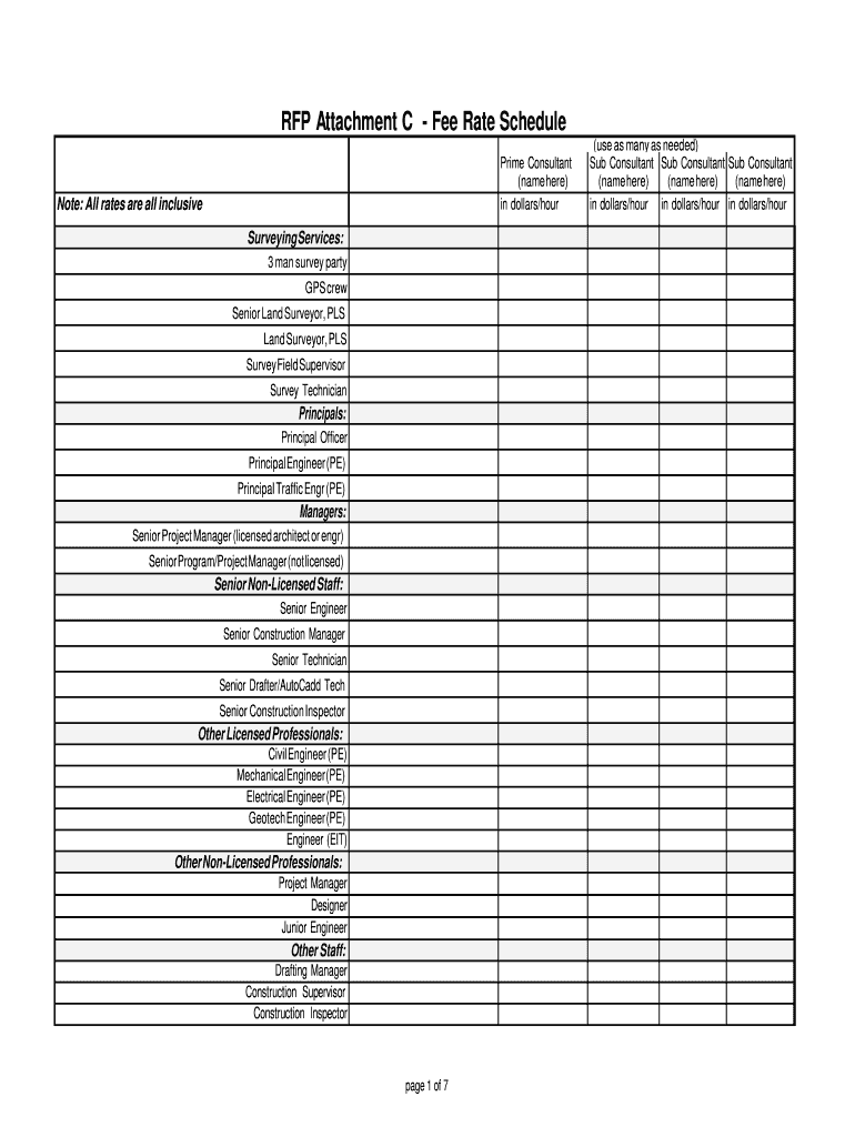 RFP Attachment C Fee Rate Schedule Prime Consultant (name here) in dollars/hormone: All rates are all-inclusive Surveying Services: 3 man survey party GPS crew Senior Land Surveyor, PLS Land Surveyor,