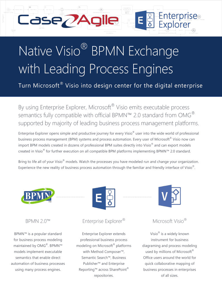 Native Vision BPM Exchange with Leading Process Engines Turn Microsoft Visions into design center for the digital enterprise By using Enterprise Explorer, Microsoft Vision emits executable process