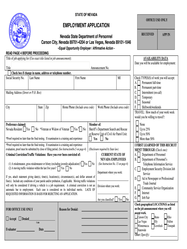 STATE OF NEVADA OFFICE USE ONLY EMPLOYMENT APPLICATION Nevada State Department of Personnel Carson City, Nevada 89701-4204 or Las Vegas, Nevada 89101-1046 -Equal Opportunity Employer / Affirmative