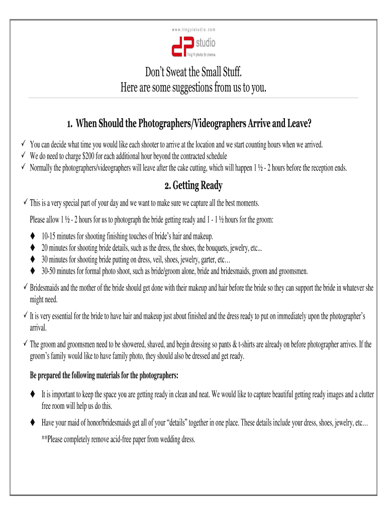 Don't Sweat the Small Stuff. Here are some suggestions from us to you. 1. When Should the Photographers/Videographers Arrive and Leave? You can decide what time you would like each shooter to arrive