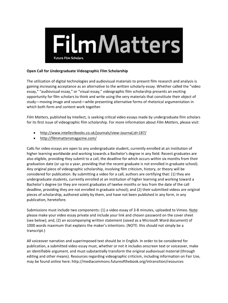 Open×Call×for×Undergraduate×Video graphic×Film×Scholarship×utilization×of digital×technologies×and×audiovisual×materials×to present×film×research×and×analysis×is gaining×increasing×acceptance×as an×alternative×to the×written×scholarly×essay.×Whether×called×the×video
