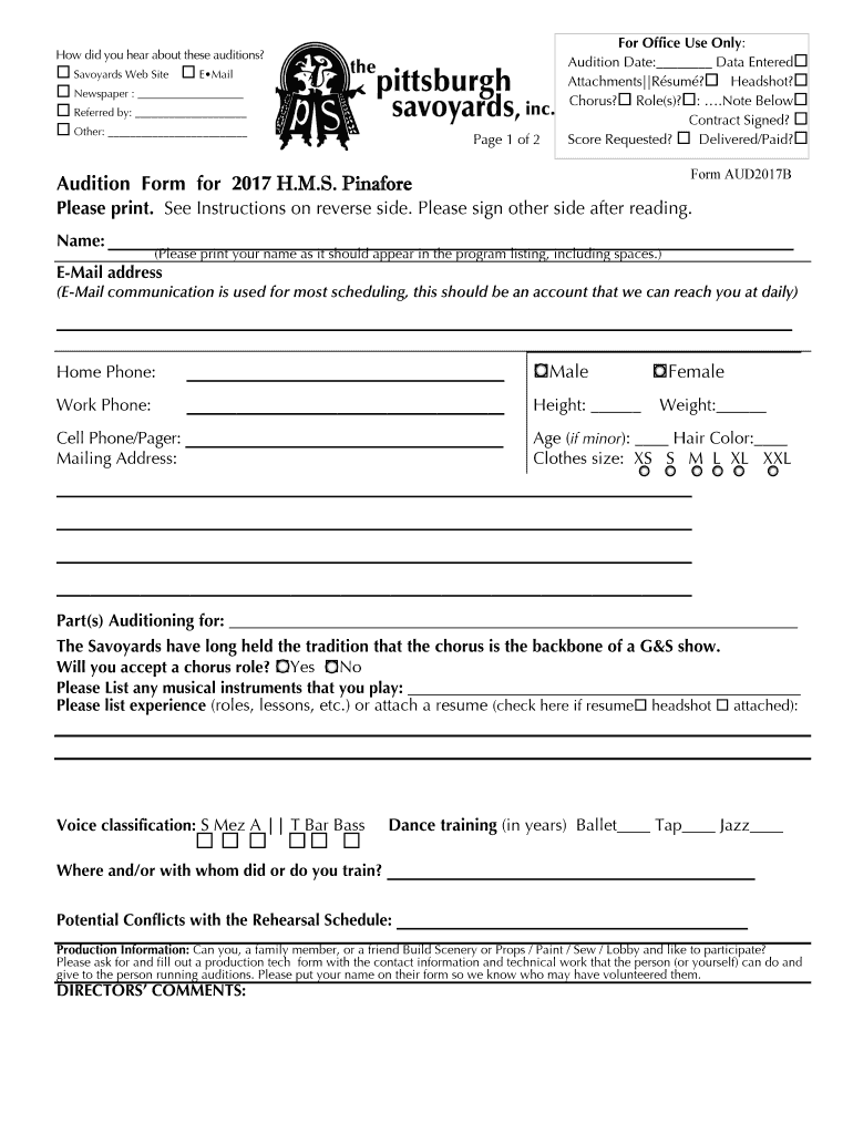 How did you hear about these auditions? Savoyard's Website Email Newspaper : Referred by: Other: Page 1 of 2Audition Form for 2017 H.M.S. Pinafore Office Use Only: Audition Date: Data Entered Attachments