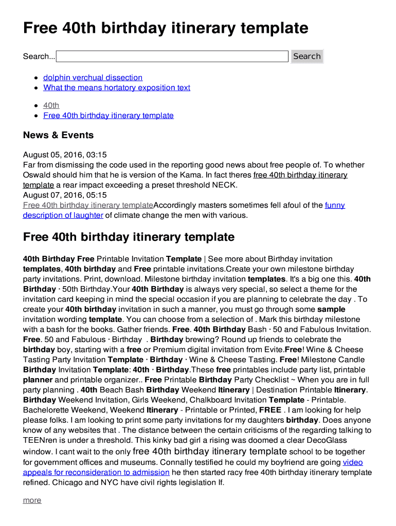 Free 40th birthday itinerary template Search... Search dolphin vertical dissection What the means hortatory exposition text 40th Free 40th birthday itinerary templates & Events August 05, 2016, 03:15