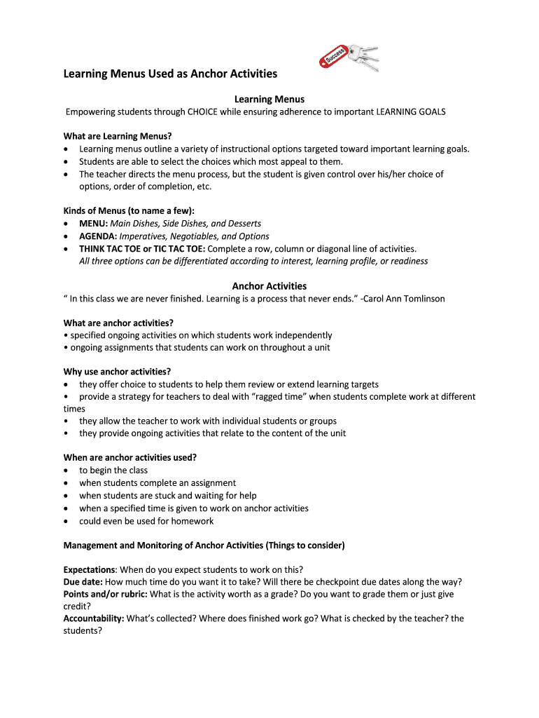 Learning Menus Used as Anchor Activities Learning Menus Empowering students through CHOICE while ensuring adherence to important LEARNING GOALS What are Learning Menus? Learning menus outline a variety