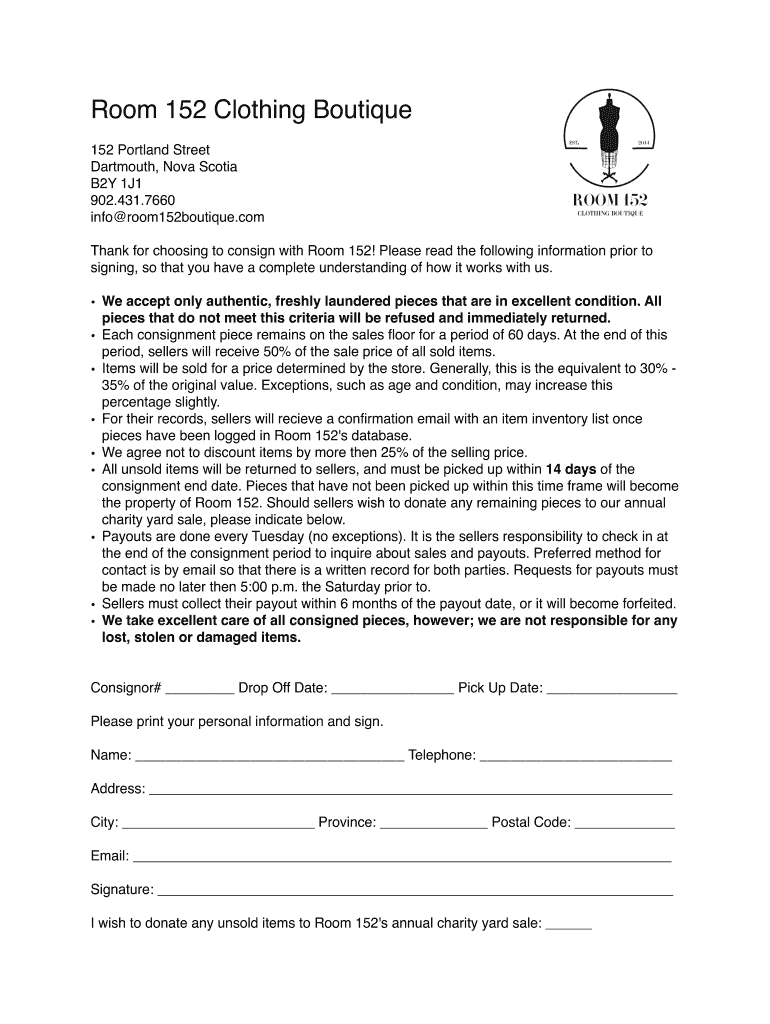Room 152 Clothing Boutique 152 Portland Street Dartmouth, Nova Scotia B2Y 1J1 902.431.7660 info room152boutique.com Thank for choosing to consign with Room 152! Please read the following information