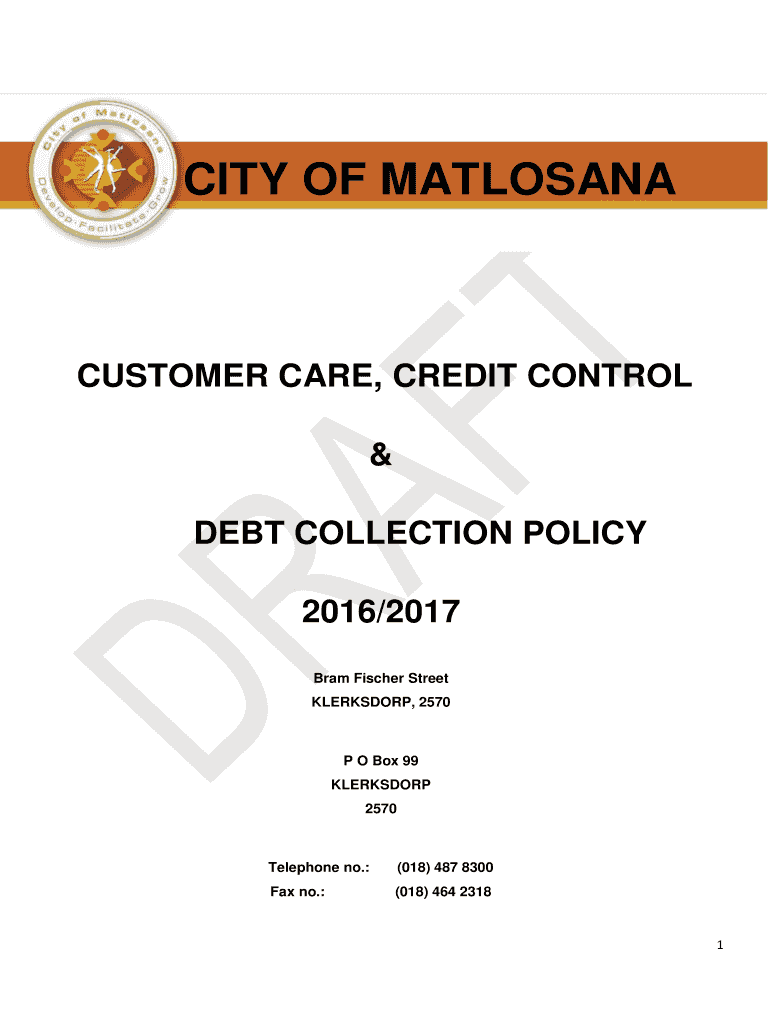 CITY OF MATLOSANACUSTOMER CARE, CREDIT CONTROL & DEBT COLLECTION POLICY 2016/2017 Bram Fischer Street KLERKSDORP, 2570P O Box 99 KLERKSDORP 2570Telephone no.:(018) 487 8300Fax no.:(018) 464 23181PREAMBLE