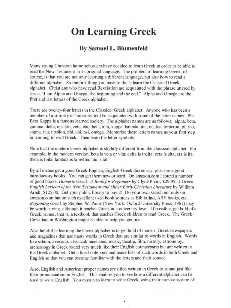 On Learning Greek Samuel L. Gruenfeld Many young Christian home schoolers have decided to learn Greek in order to be able to read the New Testament in its original language. The problem of learning