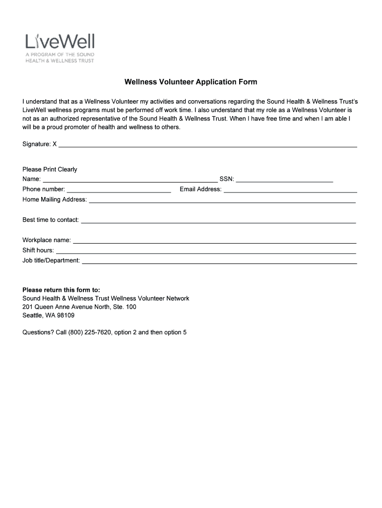 Wellness Volunteer Application Form understand that as a Wellness Volunteer my activities and conversations regarding the Sound Health & Wellness Trusts Farewell wellness programs must be performed