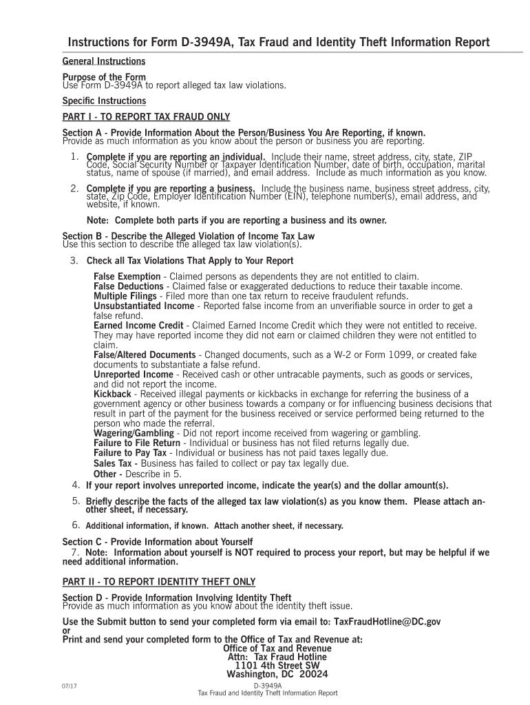 Instructions for Form D3949A, Tax Fraud and Identity Theft Information Report General Instructions Purpose of the Form Use Form D3949A to report alleged tax law violations. Specific Instructions PART