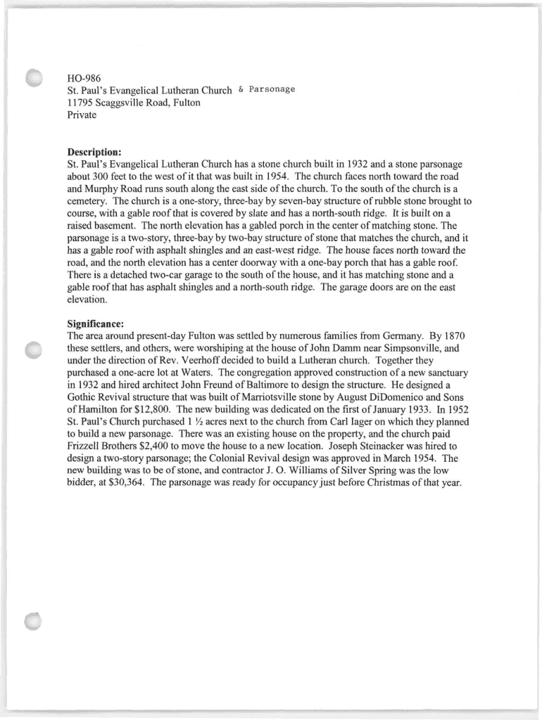 HO986 St. Paul's Evangelical Lutheran Church & Parsonage 11795 Shanksville Road, Fulton PrivateDescription: St. Paul's Evangelical Lutheran Church has a stone church built in 1932 and a stone parsonage