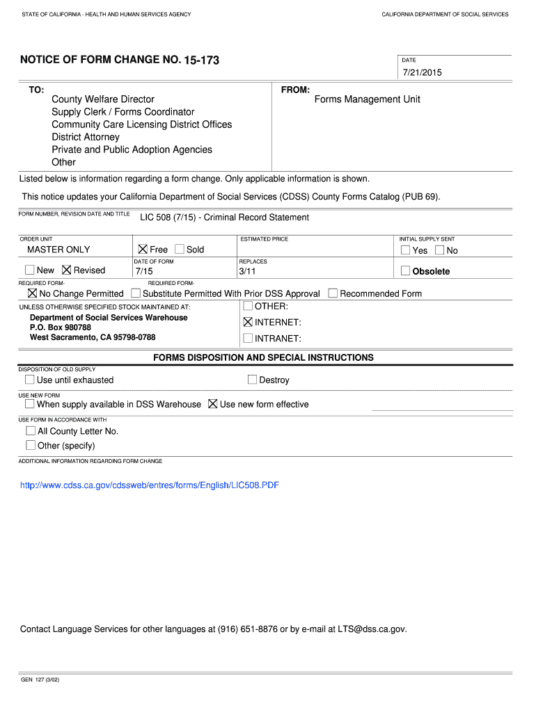 STATE OF CALIFORNIA HEALTH AND HUMAN SERVICES AGENCYCALIFORNIA DEPARTMENT OF SOCIAL SERVICESNOTICE OF FORM CHANGE NO. 15173DATE7/21/2015 TO:FROM:County Welfare Director Supply Clerk / Forms Coordinator
