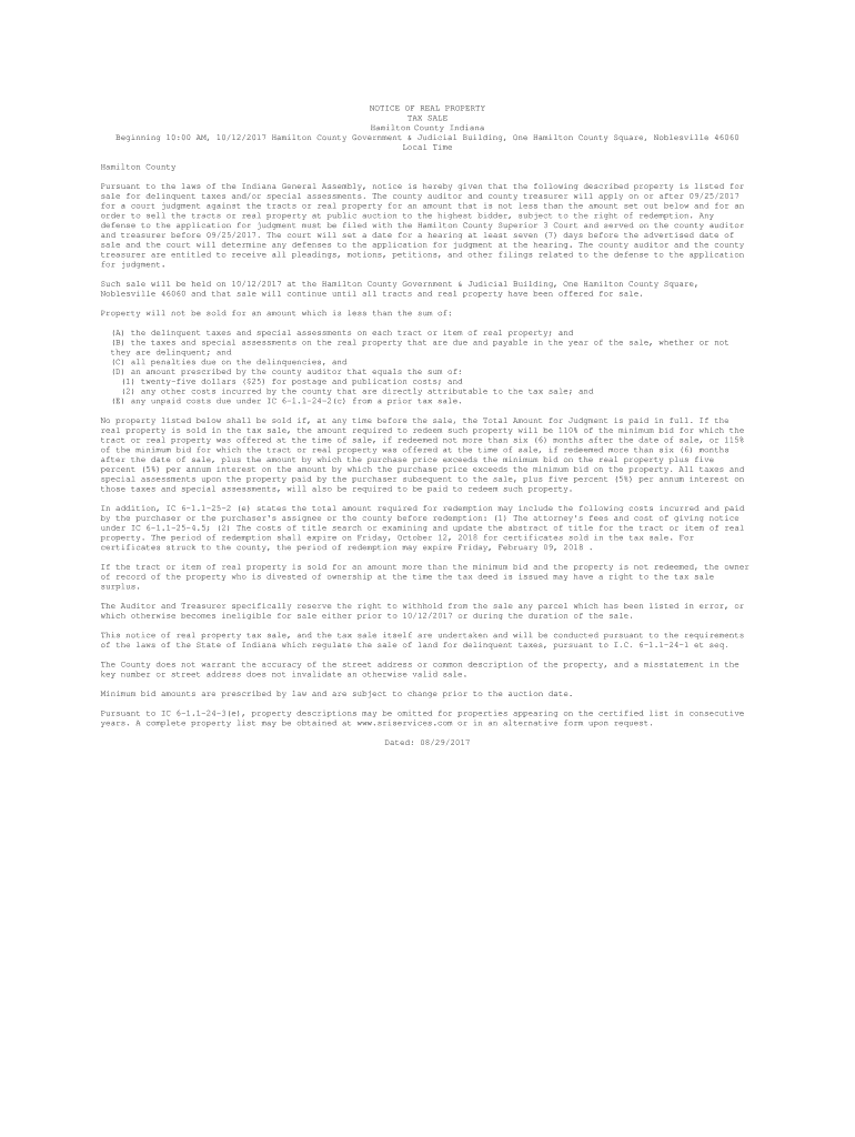 NOTICE OF REAL PROPERTY TAX SALE Hamilton County Indiana Beginning 10:00 AM, 10/12/2017 Hamilton County Government & Judicial Building, One Hamilton County Square, Noblesville 46060 Local Time Hamilton