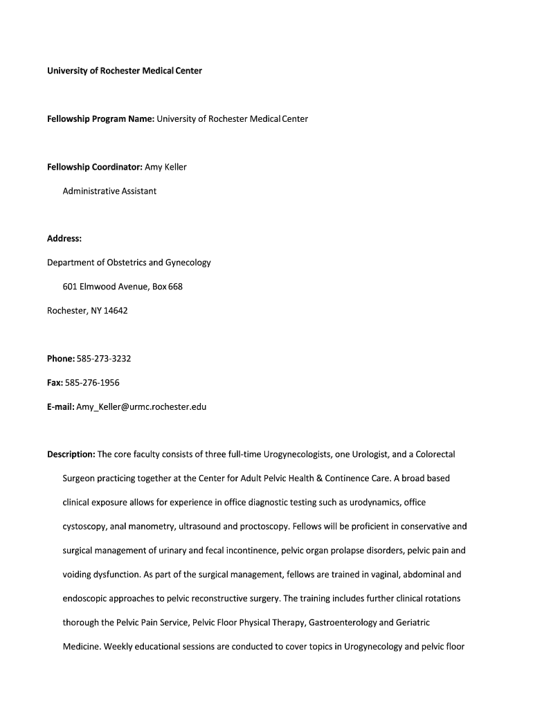 University of Rochester Medical CenterFellowship Program Name: University of Rochester Medical CenterFellowship Coordinator: Amy Keller Administrative AssistantAddress: Department of Obstetrics and