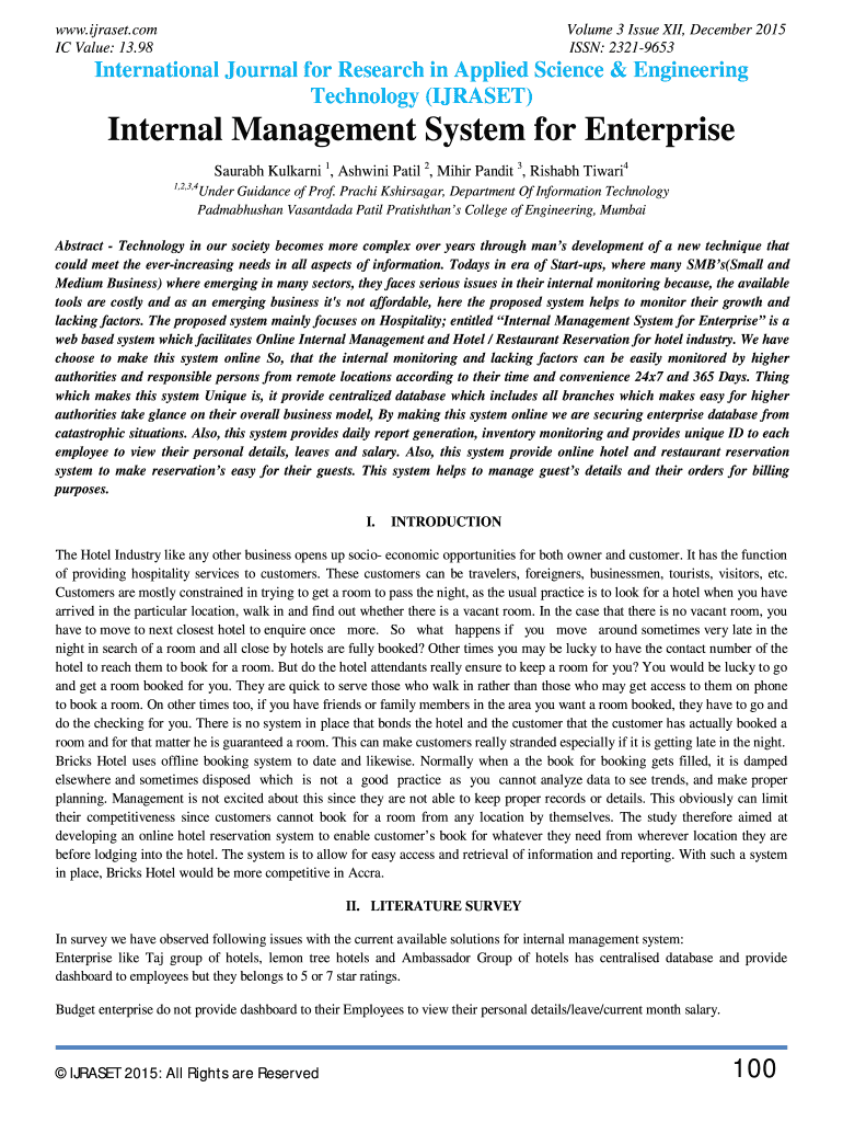 WWW.ijraset.com IC Value: 13.98Volume 3 Issue XII, December 2015 ISSN: 23219653International Journal for Research in Applied Science & Engineering Technology (ISRAEL)Internal Management System for