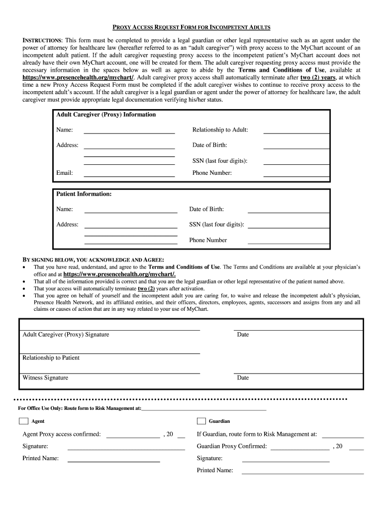 The Proxy Access Request Form is intended for legal guardians or adult caregivers acting as proxies for incompetent adults. They need valid documentation to prove their authority to access the patient's MyChart account.