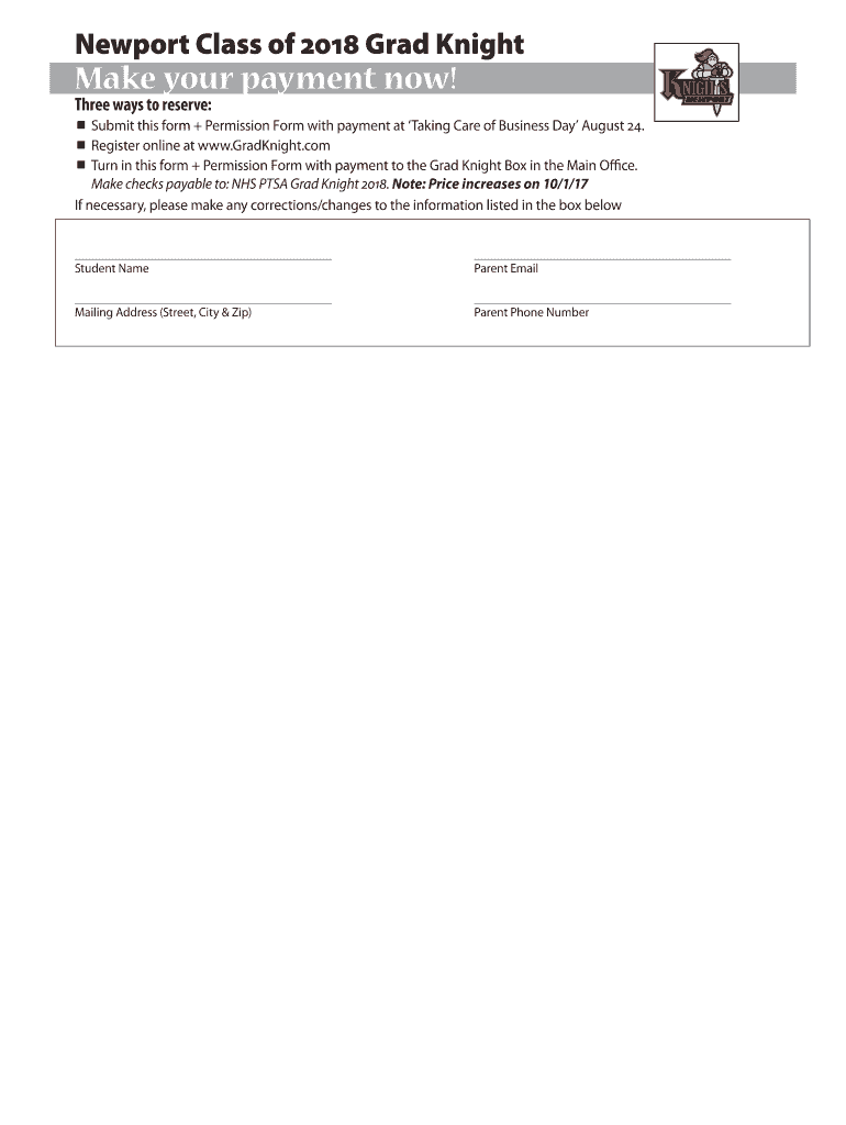 Newport Class of 2018 Grad Nightmare your payment now! Three ways to reserve: Submit this form + Permission Form with payment at Taking Care of Business Day August 24. Register online at www.GradKnight.com