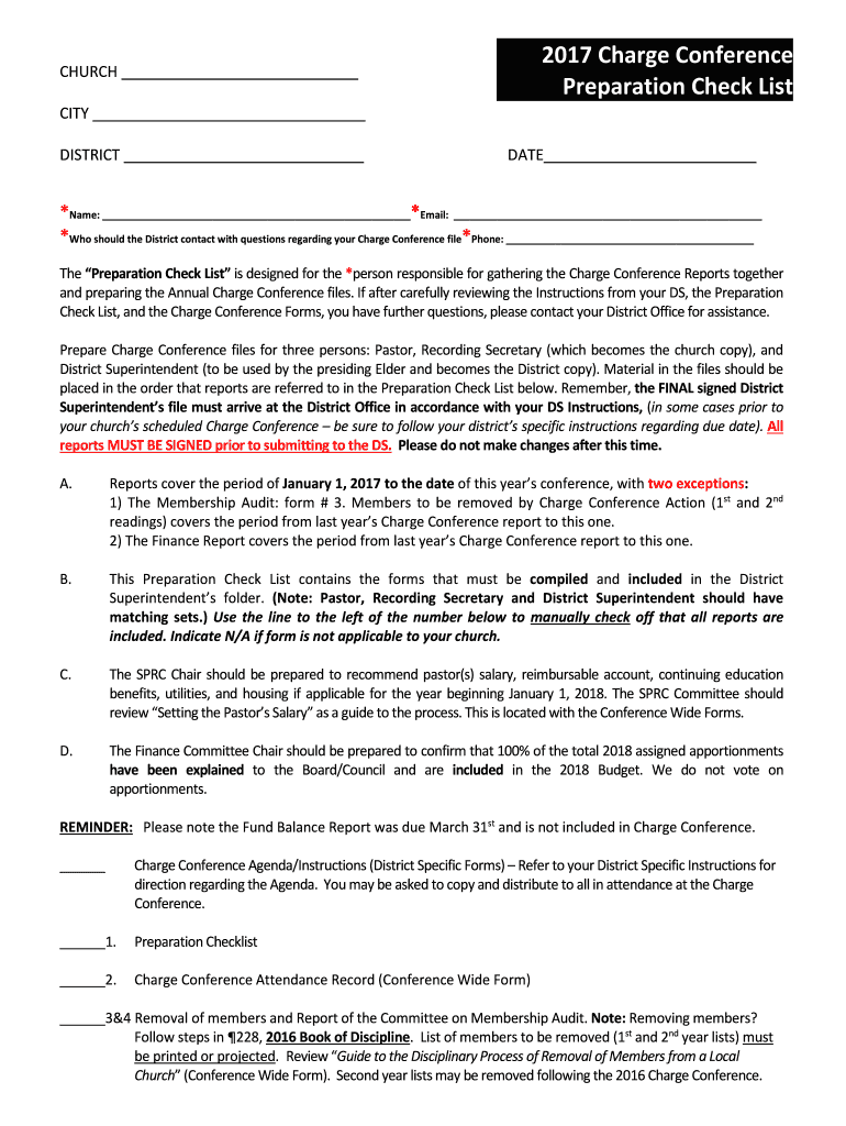 2017 Charge Conference Preparation Check Christchurch CITY DISTRICTDATE×Name: *Email: *Who should the District contact with questions regarding your Charge Conference file×Phone: The Preparation