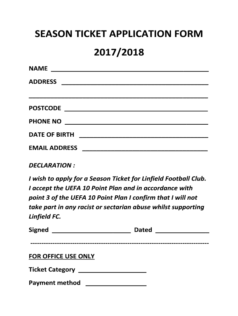 SEASON TICKET APPLICATION FORM 2017/2018 NAME ADDRESS POSTCODE PHONE NO DATE OF BIRTH EMAIL ADDRESS DECLARATION : I wish to apply for a Season Ticket for Infield Football Club. I accept the UEFA 10