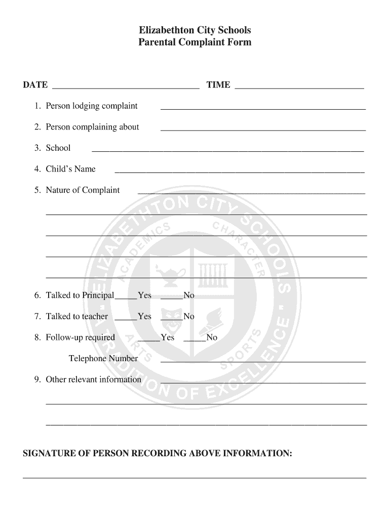 Elizabethtown City Schools Parental Complaint Format TIME 1. Person lodging complaint 2. Person complaining about 3. School 4. Child's Name 5. Nature of Complaint 6. Talked to Principal Yes No7. Talked