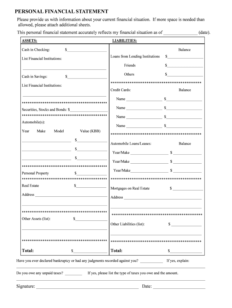 Personal financial statements can typically be filled out by providing information on assets, liabilities, income, and expenses. Specific forms and instructions may vary by jurisdiction.