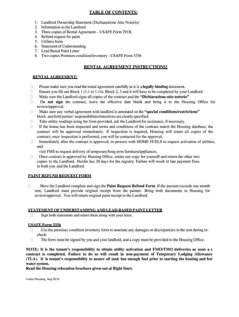 TABLE OF CONTENTS: 1. 2. 3. 4. 5. 6. 7. 8. Landlord Ownership Statement (Dichiarazione Auto Notorious) Information to the Landlord Three copies of Rental Agreement SAFE Form 291B, Refund request for