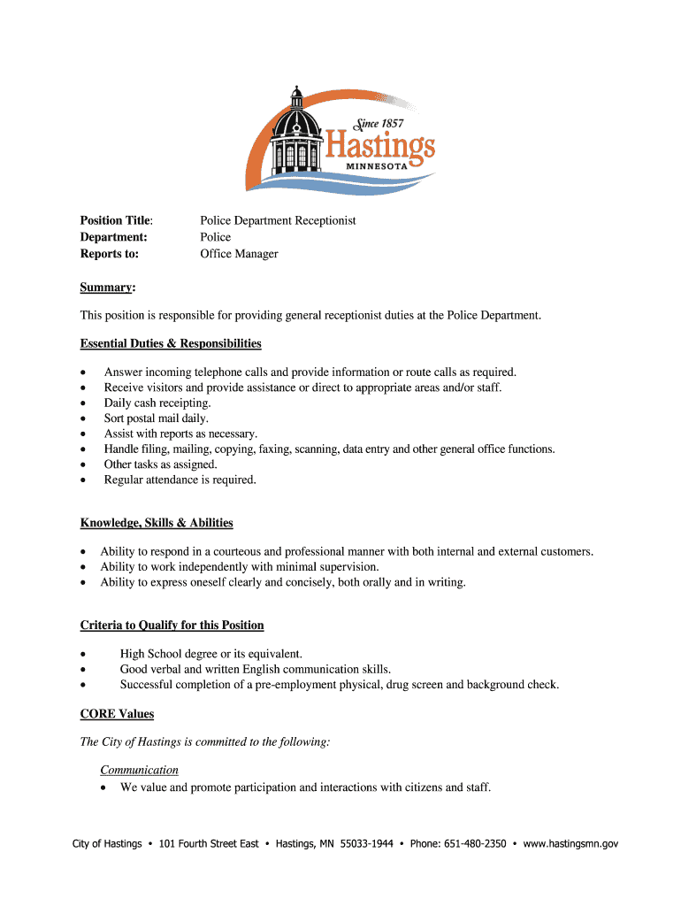 Get the free Police Department Receptionist