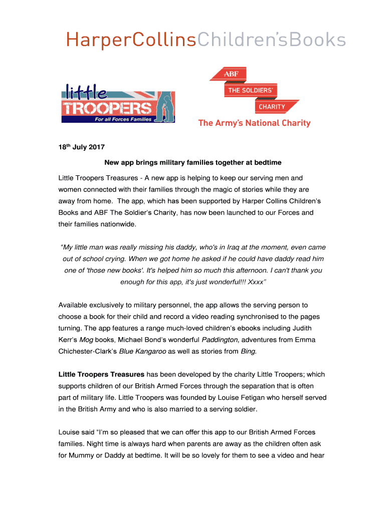 18th July 2017 New app brings military families together at bedtime Little Troopers Treasures A new app is helping to keep our serving men and women connected with their families through the magic