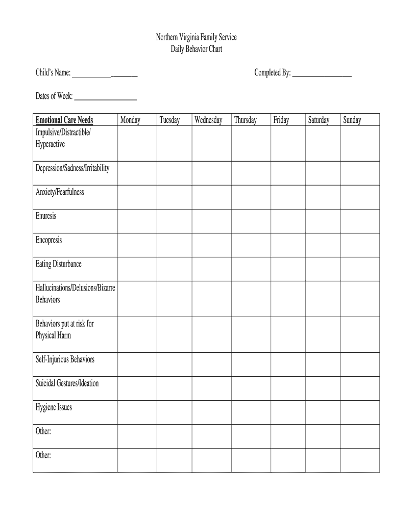 Northern Virginia Family Service Daily Behavior Chart Child's Name: Completed By: Dates of Week: Emotional Care Needs Impulsive/Distractible/ Hyperactive Depression/Sadness/Irritability Anxiety/Fearfulness