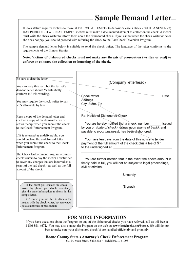 Sample Demand Letter Illinois statute requires victims to make at lest TWO ATTEMPTS to deposit or case a check WITH A SEVEN (7) DAY PERIOD BETWEEN ATTEMPTS. Victims must make a documented attempt