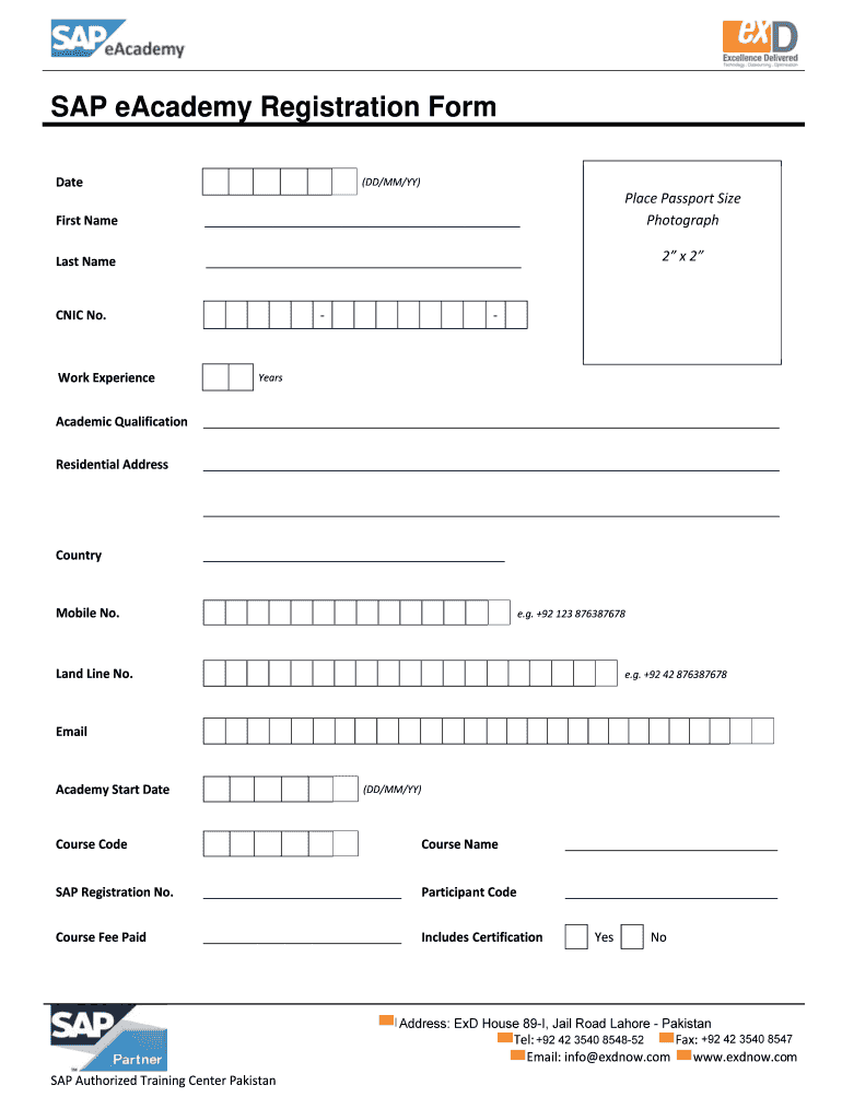 SA AP EAC academy Registration on Form First-time P PlacePassporrtSize Photograph flatware 2×2Datee(DD/MM M/BY) CNIC CNO. WorkExperienceYearsAcad demicQualificcation ResiidentialAddress.