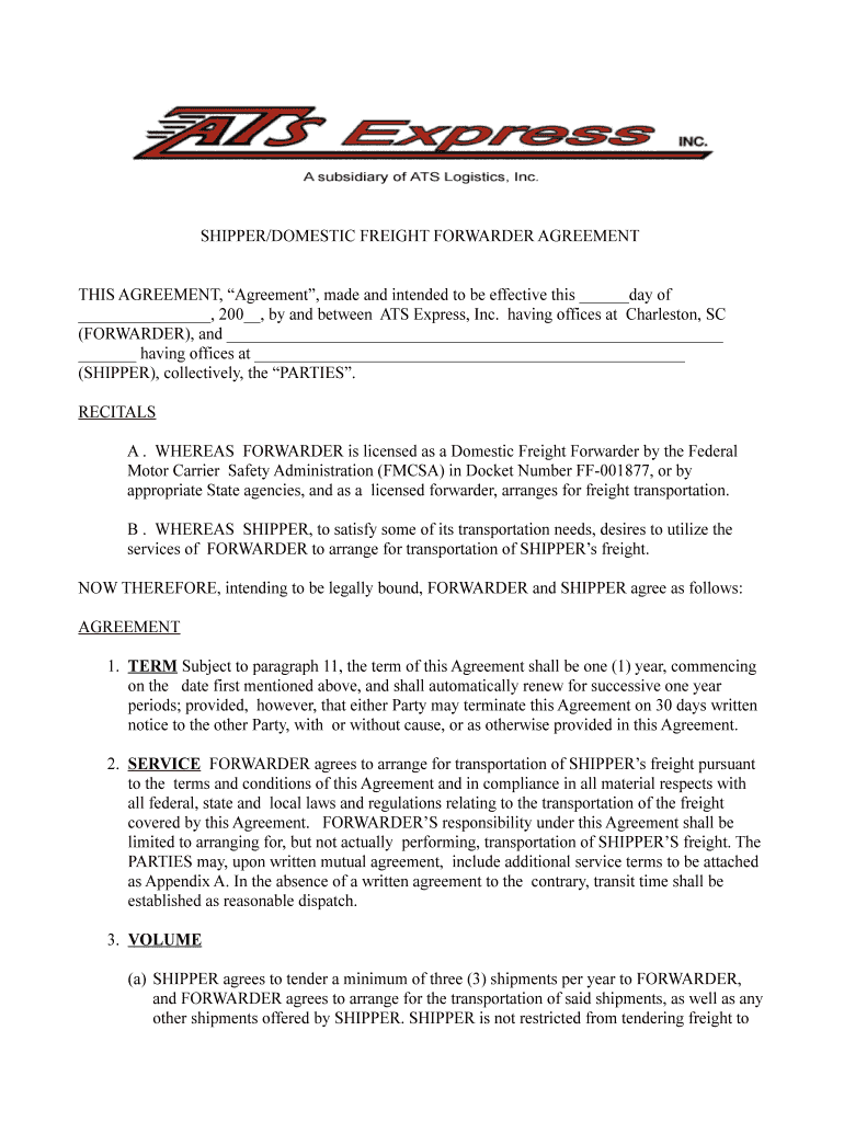 Key Features of the Shipper/Domestic Freight Forwarder Agreement