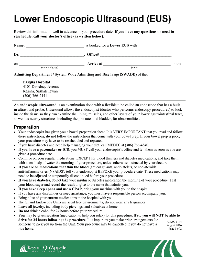Lower Endoscopic Ultrasound (EUS) Review this information well in advance of your procedure date. If you have any questions or need to reschedule, call your doctor's office (as written below). Name: