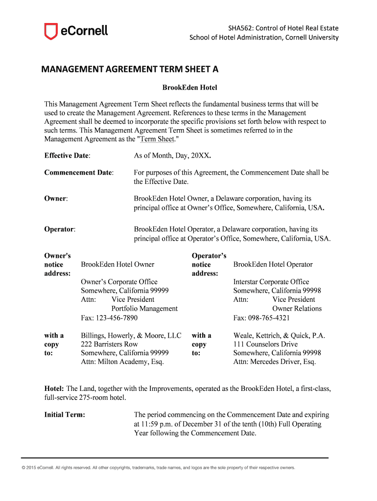 SchoolofHotelAdministration, CornellUniversityMANAGEMENTAGREEMENTTERMSHEETABrookEden Hotel