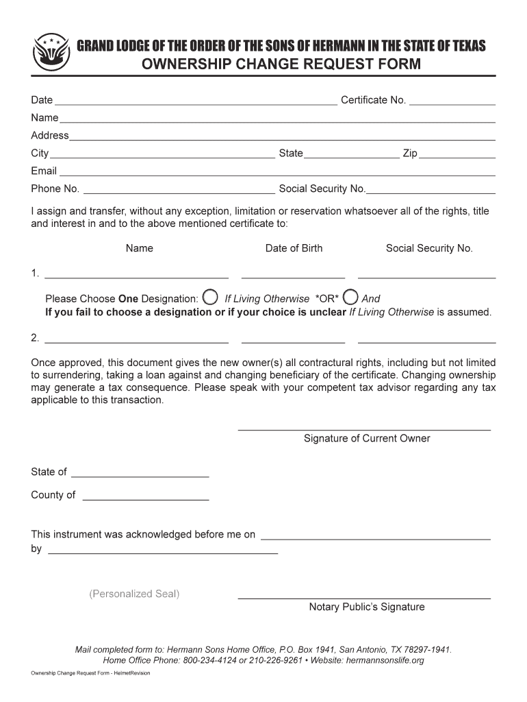 GRAND LODGE OF THE ORDER OF THE SONS OF HERMANN IN THE STATE OF TEXASOWNERSHIP CHANGE REQUEST Format Certificate No. Name Address City State Zip Email Phone No. Social Security No. I assign and transfer,