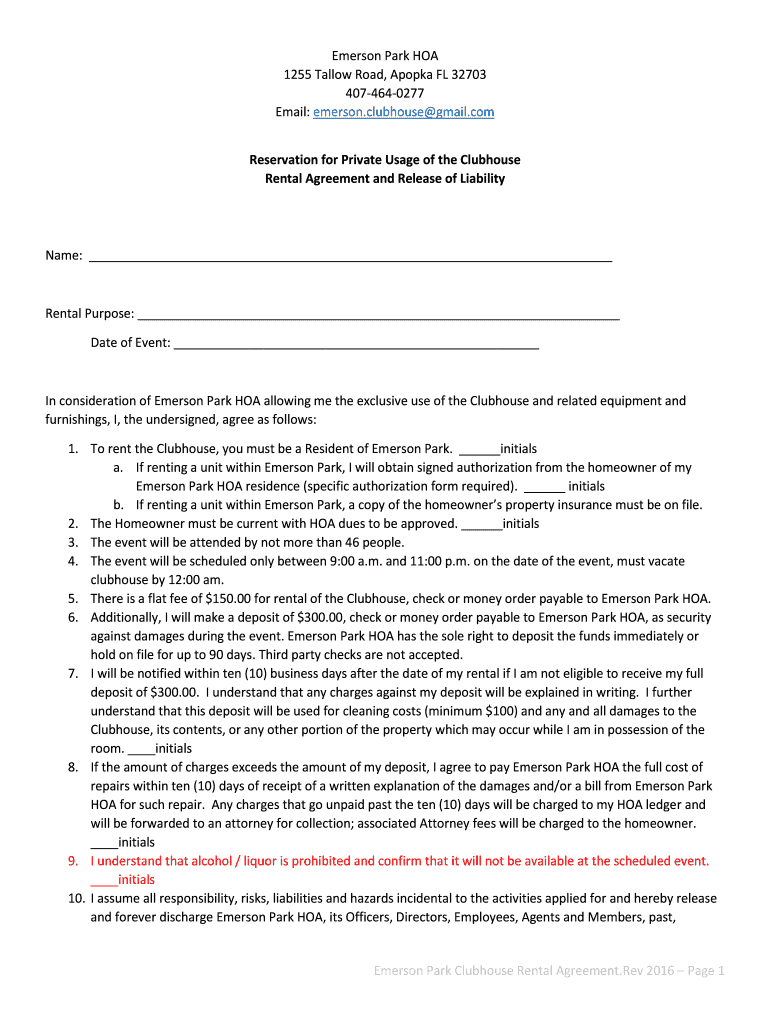 Emerson Park HOA 1255 Tallow Road, Apopka FL 32703 4074640277 Email: Emerson. Clubhouse gmail.com Reservation for Private Usage of the Clubhouse Rental Agreement and Release of LiabilityName: Rental