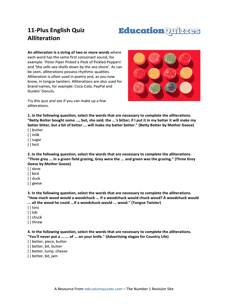 11Plus English Quiz Alliteration An alliteration is a string of two or more words where each word has the same first consonant sound, for example: 'Peter Piper Picked a Peck of Pickled Peppers, and