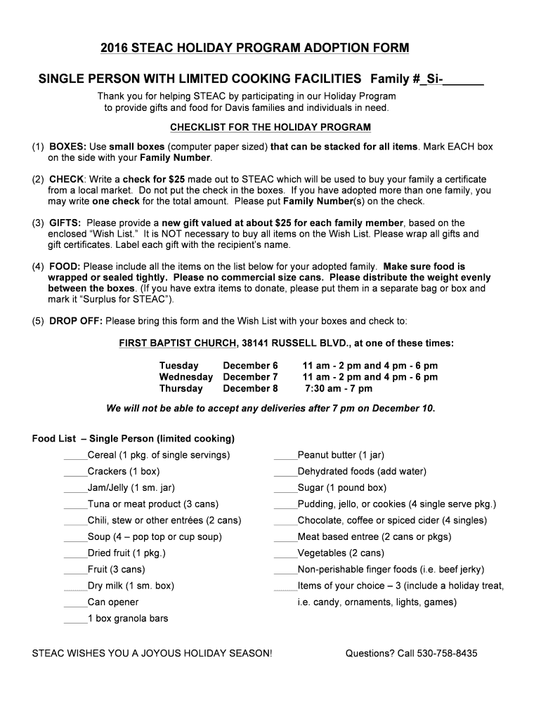 2016 STEAM HOLIDAY PROGRAM ADOPTION FORM SINGLE PERSON WITH LIMITED COOKING FACILITIES Family # Si Thank you for helping STEAM by participating in our Holiday Program to provide gifts and food for
