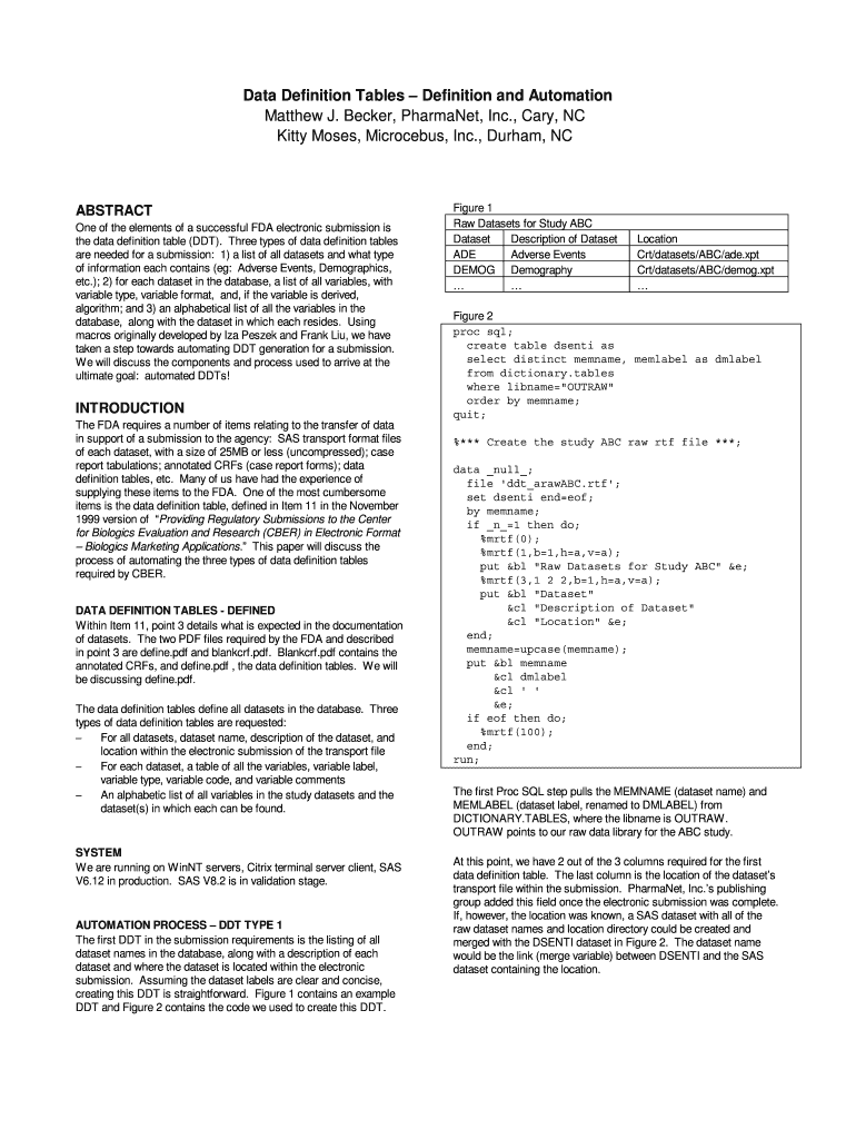 Data Definition Tables Definition and Automation Matthew J. Becker, Permanent, Inc., Cary, NC Kitty Moses, Microbus, Inc., Durham, ABSTRACT One of the elements of a successful FDA electronic submission